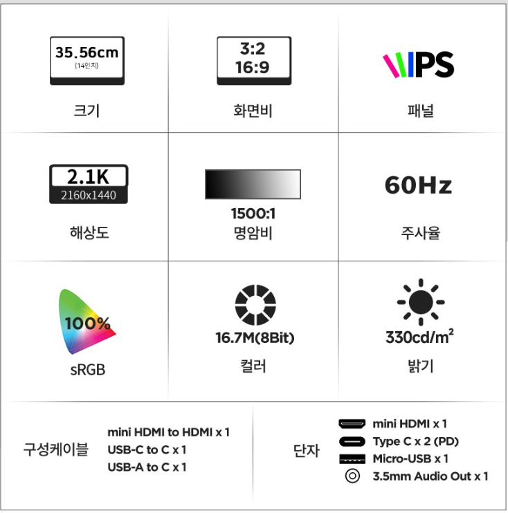 특이사항으로는 휴대용 모니터이기 때문인지 모르겠지만, 해당 모니터에 전원을 인가하기 위한 전원 케이블이 포함되어 있지 않습니다. (전원 공급은 5핀으로만 받을 수 있는 것으로 보여집니다)