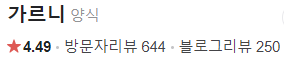 2024-06-22일 기준 방문자 리뷰수 644, 블로그리뷰 250에 평점은4.49네요. 괜찮은 성적이죠. 그만큼 많은 사람들이 방문해주셨으니.. 저는 여기 오면 항상 새우 먹물 리조또를 먹습니다. 처음 이 식당 생기고서 친구랑 처음 갔을 때 먹은 메뉴가 저거기도 하고.. 제가 처음 식당에 방문해서 먹은 음식이 맛있으면 어지간해선 두번째 방문할 떄도 그 메뉴를 시키는 성격이라서.. ㅎㅎ..