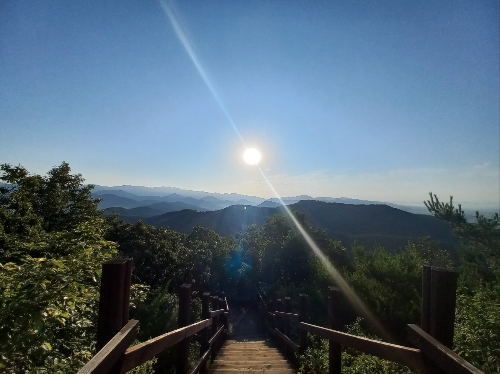 너무 멋있지 않나요? 어른들이 왜 저 산의 능지, 능선을 바라보면서 "한마리 용이 펼쳐져있구나" 라고 표현하는 이유를 알 것 같습니다. 저 정상 부근에서 저 멀리 능선이랑 안개, 자연 풍경 바라보고 있으니 참 고요하더라구요. 주변에 사람도 없고, 바람은 선선히 불고, 구름이 유유히 흘러가는 게 참 힐링이었습니다. 온갖 나무 향도 한몫하구요..
