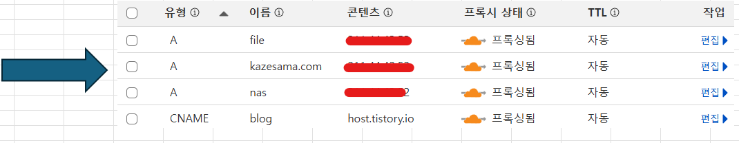 호스팅kr과의 다른 점이 눈에 띄더라구요. 호스팅Kr에서도 찾아보면 아마 있을 기능일 듯 한데 도메인 구입 후에 저렇게 A 레코드와 CNAME을 추가하면 그 DNS에 대해 프록시을 자동으로 걸어줍니다. 근데 이게 찾아보니 SSL인증서를 발급받아서 https 상태로 만들 때 라우터(공유기) 단이나 해당하는 저 서비스들 nas나 블로그쪽에서 해외 접속 차단이 설정되어 있으면, 외부에서 여러분들이 설정하신 도메인으로 접속할 때 저 프록싱 기능을 사용하게 되면 , 클라우드 플레어 쪽으로 경유한 후에 접속을 하기 떄문에 해외 접속 차단이 되어 있으면 ssl 인증서 tls 인증 할때 문제가 될 수 있습니다. 저 역시 그래서 라우터 단에서 해외접속 차단을 풀었어요 원래는 미국 일본 한국만 접속되도록 하고있었습니다. 저 프록시 기능을 켰을 떄 안되더라구요. 그래서 해외접속 차단 해놓으신 분들은 뭐 다른 방안을 생각하셔야할 겁니다.