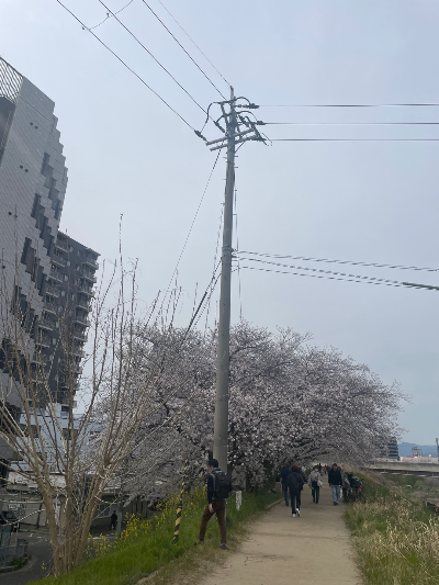 4월의 길고 긴 화요일, 수요일, 목요일, 금요일이 지나고 주말이 와서 벚꽃이 핀 요도가와 강 근처에서 사진 한 장..