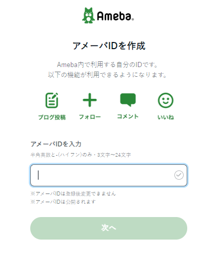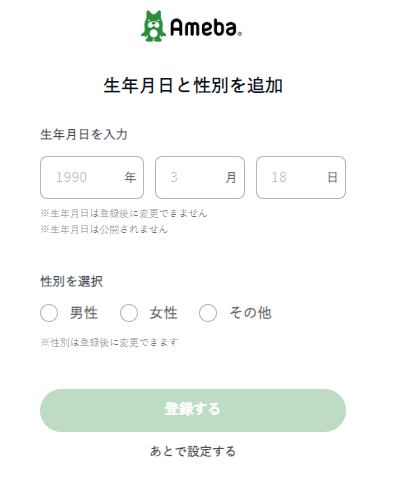아메바 블로그에서 사용할 아이디와 , 비밀번호, 생년월일, 성별 등 기타 정보를 입력하면 최종적으로 아메바 블로그를 사용할 수 있습니다.