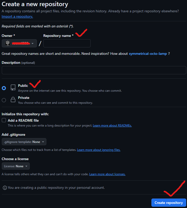 2. Repository 생성 단계 - 생성할 Repository의 이름 입력 후 Public으로 생성