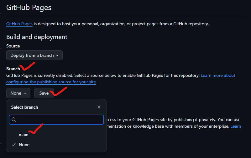 4. Repositoy 리포지토리의 설정으로 들어가서, Pages 탭에 접근한 후 Branch의 None으로 기본 설정되어 있는 부분을,