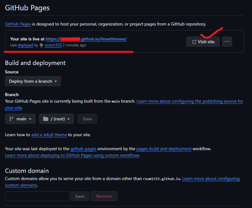 main으로 변경 후 'Save'를 눌러주세요. 조금 기다리시면 몇 초~ 몇 분 이내에 새로고침 해서 확인해보시면, 여러분께서 업로드하신 파일을 Github pages에서 배포하여 사이트 링크 하나 뜨는 것을 확인하실 수 있습니다. Visit Site를 눌러서
