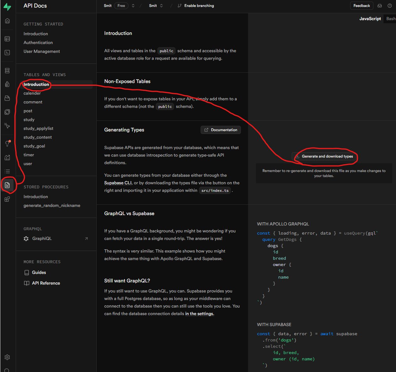 1. Supabase Dashboard로 들어와서 위와 같은 경로를 따라, Generate and download types를 눌러준다.