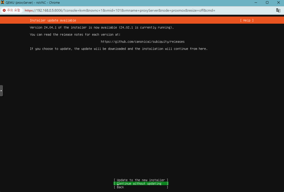 두번째 Continue Without updating 선택하여 응 업데이트 안하고 쓸거임 선택해주세요.