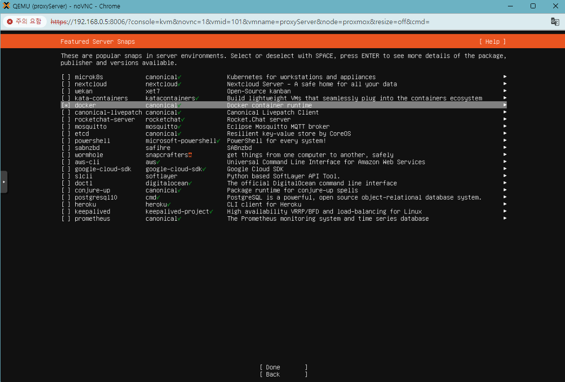 마지막 필요한 패키지 설치할 것인지 물어보는군요. docker가 필요하여 도커만 설치해놓는 걸로 체크하겠습니다