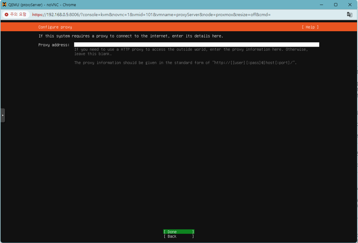 proxy 설정할건지 물어보는 창인데 필요없는데 싹 다 default 로 설치합시다. 나중에 전부 변경 가능한 옵션들은 묻는 것입니다. 다 엔터 눌러주세요.