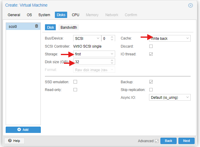 디스크 설정이라 합니다. Cache : Write back , 우분투의 저장소, 우분투 디스크를 어느정도로 공간을 할당해줄건지 용량을 설정해줍니다.