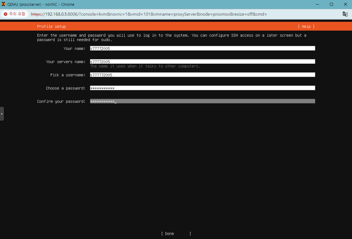 유저 아이디, 유저 비밀번호 설정하는 부분입니다. 우분투 로그인할 때 쓰이니 잘 설정해주세요.