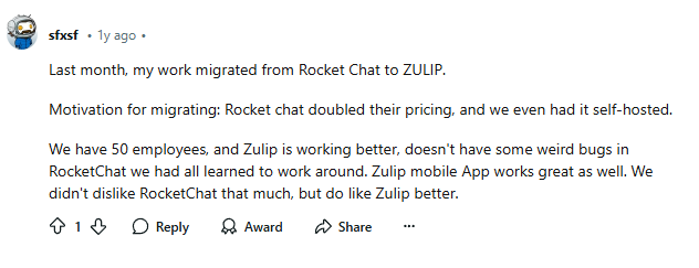 3. 결론적으로 현재 점유율은 reddit에서도 많은 이야기가 나왔는데요. zulip으로 많이 이동하는 추세인가봅니다.