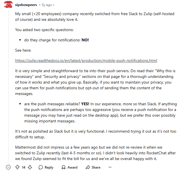 https://www.reddit.com/r/selfhosted/comments/hj74pg/mattermost_vs_rocket_chat_vs_zulip/