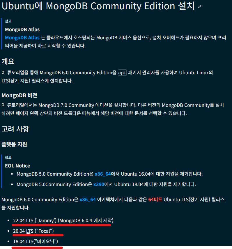 제가 무시한 사항은 MongoDb 5.0,6.0,7.0 버전들은 우분투 LTS 22.04, 20.04 버전을 공통적으로 지원하지.
