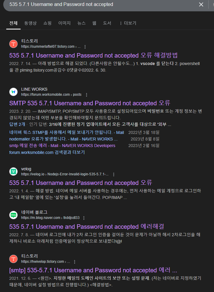 -> 여튼 이 smtp로 메일 전송하기 문제는 535 5.7.1 Username and Password not accepted
