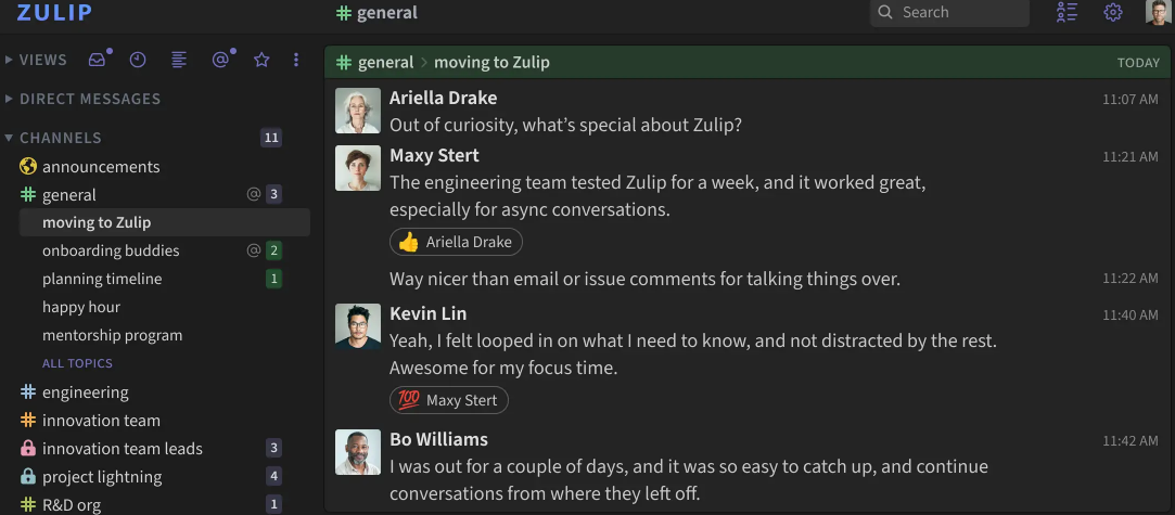 Zulip의 문제1. 처음 설치가 완료되고, 메인화면으로 진입하면 UI가 너무 복잡하다 -> Rocket.chat이 깔끔하고 ,심플했던 거에 비하면 정말 별로다. (UI가 직관적이지 못하다.) 그냥 개인적인 견해입니다. 제가 심플한 오픈 채팅 프로젝트를 찾고있어서요.