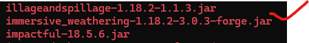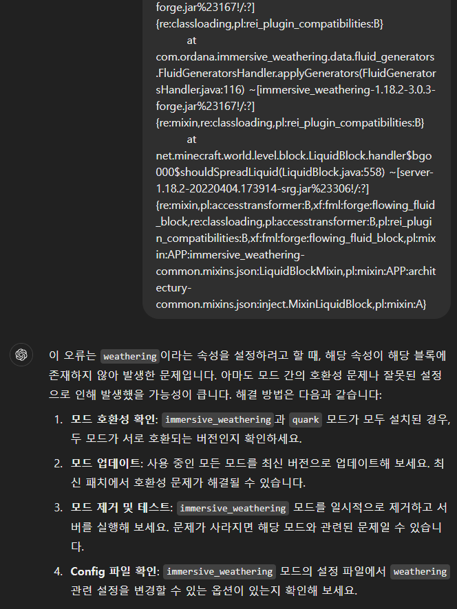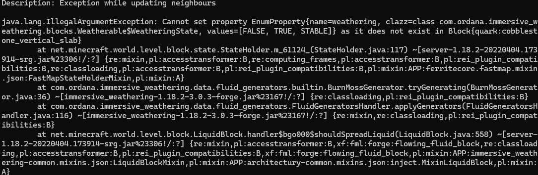 모드 중 서버 패키지 안에 포함된 immersive_weathering 이라는 자연 환경 침식 작용, 자연환경 텍스처와 같은 걸 설정하는 모드에서 충돌이 발생한 것으로 보인다.