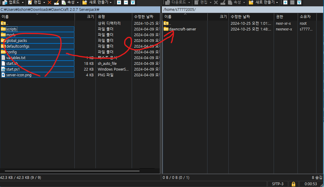 우분투의 내 홈 디렉토리에 dawncraft 폴더를 만들어주었다 여기다가 아까 압축 푼 파일을 옮겨줘야하기 때문