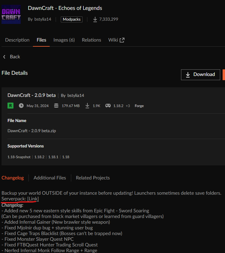DawnCraft라고 하는 서버 팩은 여기에서 다운로드 받을 수 있었다.